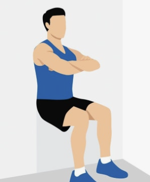 벽 스쿼트: 벽에 등을 기대고 의자에 앉는 자세로 버티는 운동입니다.