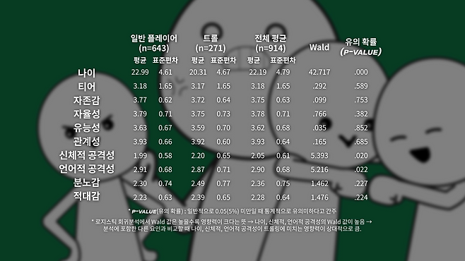 분석 결과에 따르면 통계적으로 유의미한 요인에 나이와 신체적·언어적 공격성이 확인됐습니다. 나이가 어릴수록 트롤링할 확률이 높았는데, 다른 선행 연구에서도 나이가 어린 플레이어들은 게임 내 상호작용에서 비방이나 비난과 같은 부정적인 상호작용을 할 가능성이 높았던 것과 일치하고, 분석 데이터에 따르면 나이가 한 살 증가하면 트롤이 될 가능성이 약 11.5% 줄어든다고 합니다.