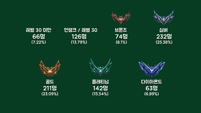 응답자 중 남성은 770명(84.25%), 여성은 144명(15.75%)이었고, 평균 연령은 22.19세(표준편차=4.78)였으며, 게임의 레벨/티어는 아래와 같습니다.