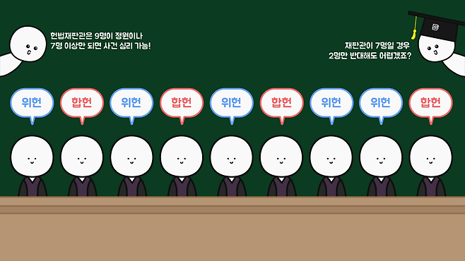 이런 요청 중 형식적인 요건이 충족되면 위헌 여부를 판단하고, 반드시 6인 이상의 위헌 의견이 있어야 합니다. 즉, 반대 의견이 4명만 있으면 법을 없앨 수 없다는 겁니다.