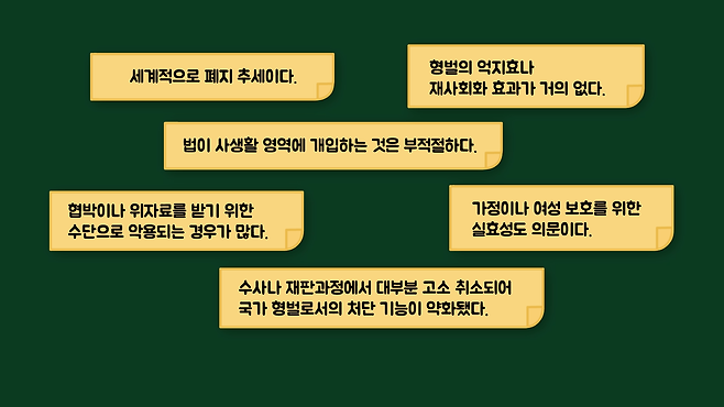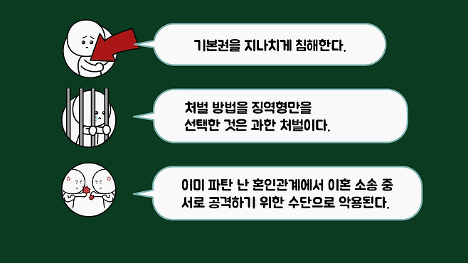 간통죄의 존재를 부정하는 사람들이 입법 목적을 부정하는 건 아닙니다. 다만 아래와 같은 이유로 죄에 문제가 있다고 보는 경우였습니다.
