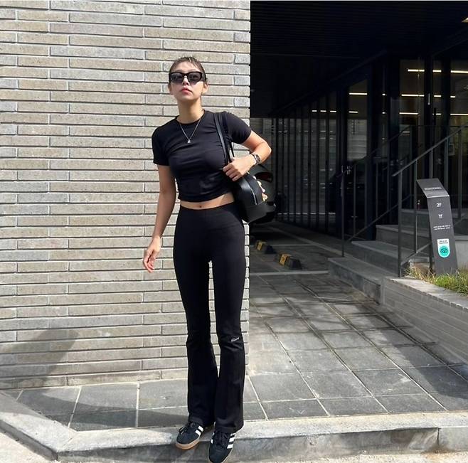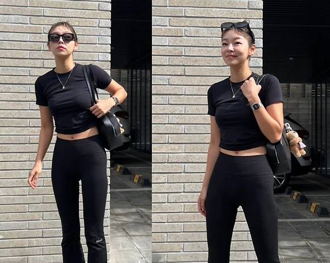 또 송해나는 블랙 하이웨이스트 레깅스로 스포티한 느낌을 주면서도 길어 보이는 다리 라인을 자랑한 스포티한 패션을 선보였습니다.