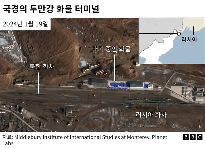 컨테이너선, 열차 등 다양한 수단으로 북한산 포탄, 그라드 로켓(다연장로켓) 등 실전 화력 무기가 러시아 전방까지 속속 투입되고 있는 게 위성으로 확인됐다.