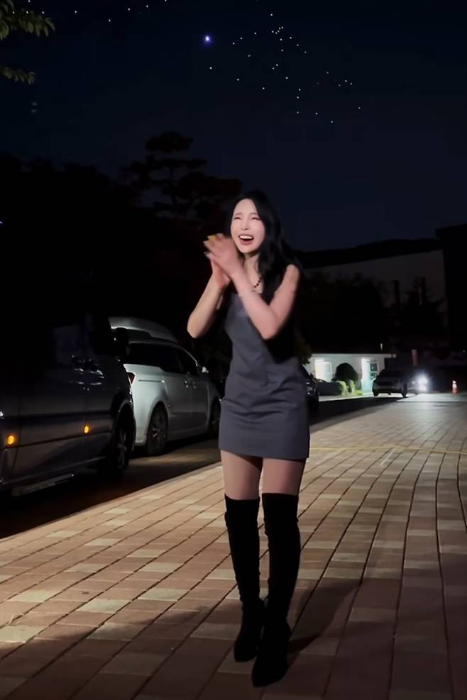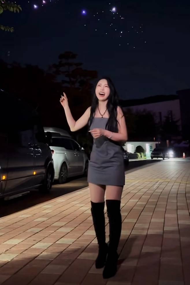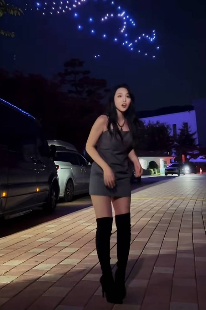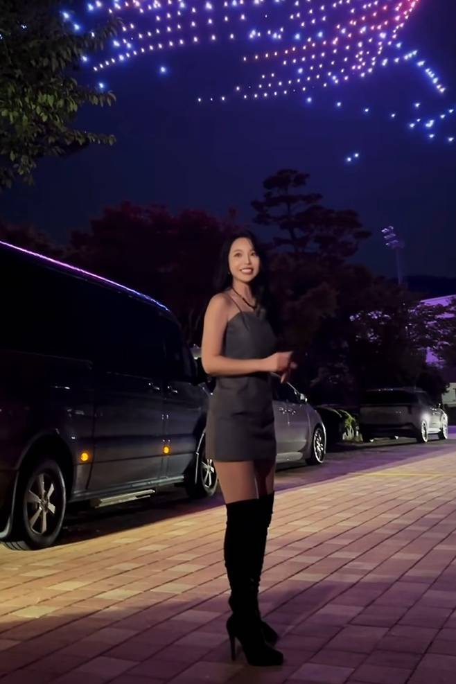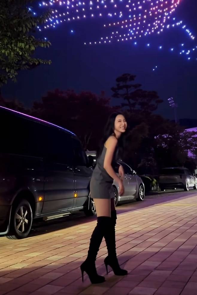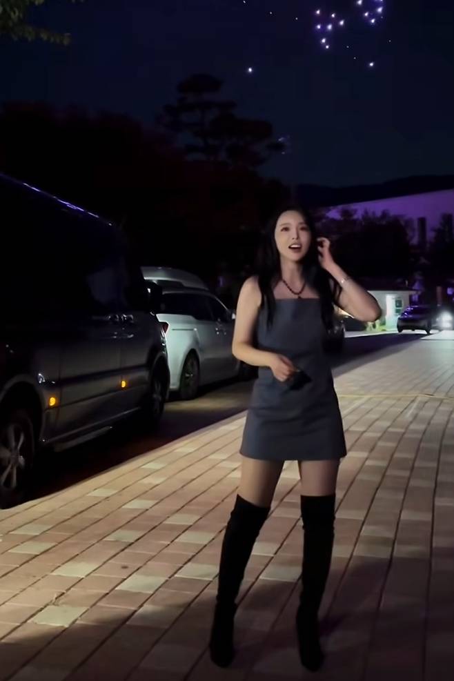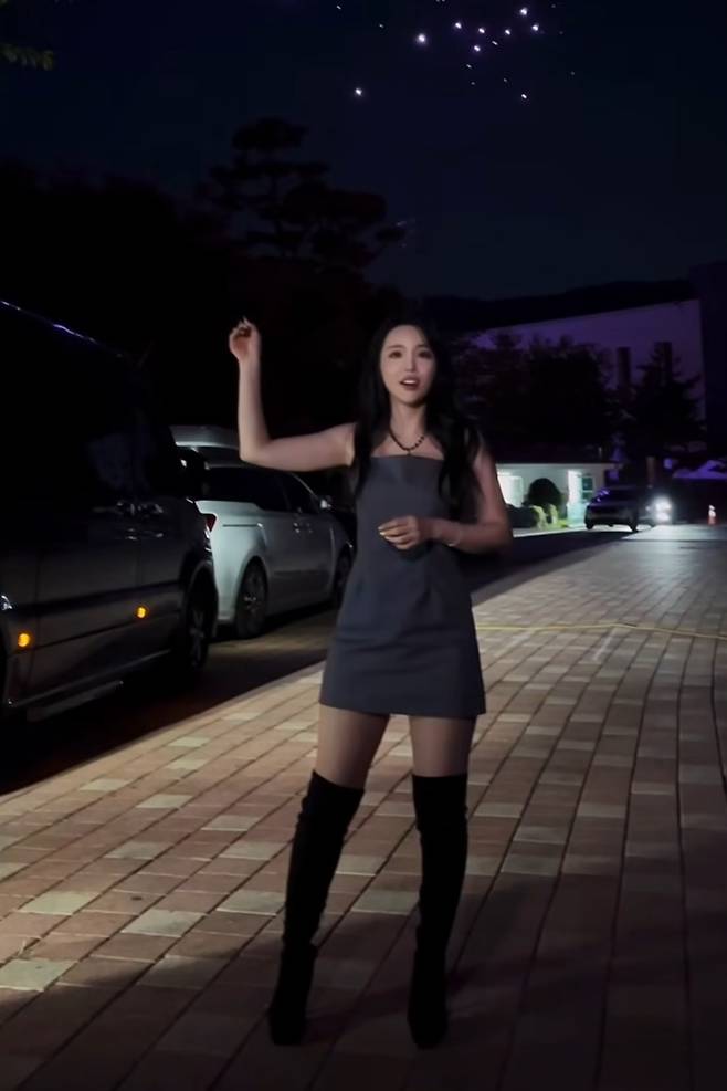 민소매 원피스와 긴 웨이브 펌의 조화가 홍진영의 미모를 더욱 돋보이고 있습니다.