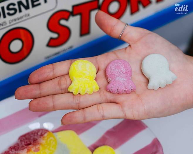 문어 시리즈는 어디선가 먹어본 적 있는 새콤한 과일 젤리 맛. 생긴 건 귀엽지만 맛에 특색은 없다. 옅은 민트색 젤리들은 소다 맛이다. 입안에 넣으면 옅은 탄산감이 보글보글 느껴져서 신기하다. 노란색과 갈색이 반반 섞인 타원형의 젤리는 초코 바나나맛. 초코 바나나맛 젤리는 처음 먹어보는데, 인공적인 바나나 향과 캐러멜을 태운 듯한 맛이 특이하다. 역시 젤리라기엔 초코 캐러멜에 가까운 맛과 식감이다.