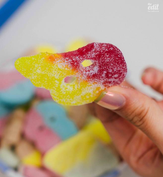해골인지 고양이인지 모를 모양의 이 젤리에는 신 가루가 듬뿍 묻어있다. 맛은 달달한 풍선껌 맛. 두께가 다른 것보다 얇아서 덜 질기고 부드럽게 씹힌다. 이게 두 번째로 맛있었다. (첫 번째는 곧 나온다.)