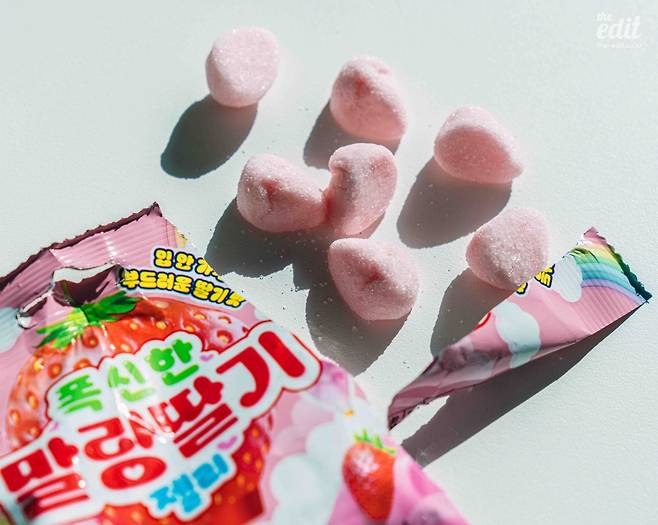 먼저 ‘폭신한 말랑딸기 젤리’. 딸기 우유처럼 밀키하고 달콤한 젤리다. 겉에 가루가 잔뜩 묻어 있지만, 신 맛은 전혀 없다. 이름처럼 정말 폭신하고 말랑하다. 스웨디시 젤리와 비교해도 그렇고, 일반 젤리와 비교해도 훨씬 부드럽다.