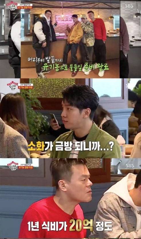 이승기가 “단가가 높을 텐데”라고 하자 박진영은 “JYP엔터테인먼트 구내식당 1년 식비가 20억 원 정도”라고 해 모두를 놀라게 했습니다.