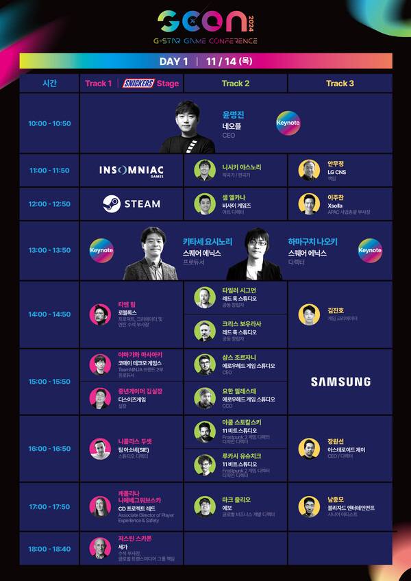 국내 최대 게임쇼 지스타 기간에 개최되는 국제 게임 콘퍼런스(G-CON)의 최종 연사와 시간표가 10일 공개됐다.