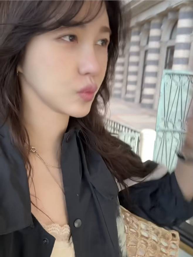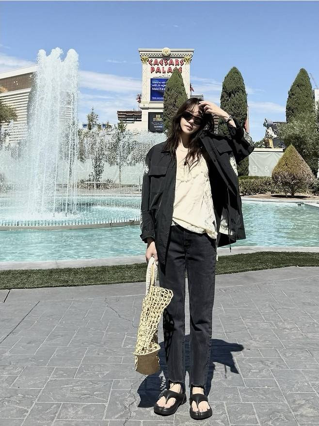 분수 앞에서 블랙 셔츠형 아우터를 걸치고 아이보리색 민소매 톱과 블랙 데님 팬츠를 매치해 편안하면서도 시크한 무드를 자아냈습니다.