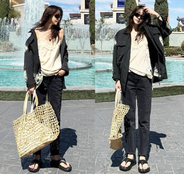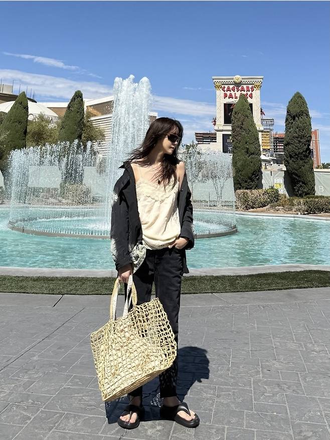 플리플랍 샌들과 함께 내추럴하면서도 트렌디한 '꾸안꾸' 스타일을 보여준 이지아는 화려한 라스베이거스 거리에서도 단연 눈길을 끄는 존재감을 발산했습니다.