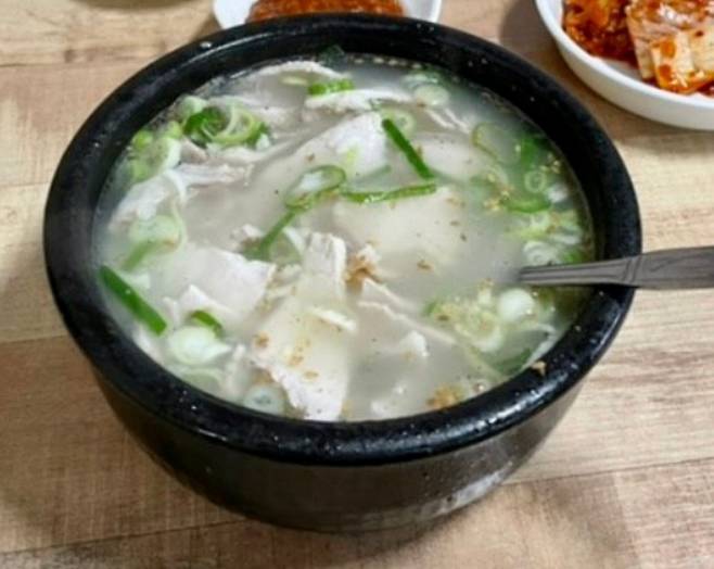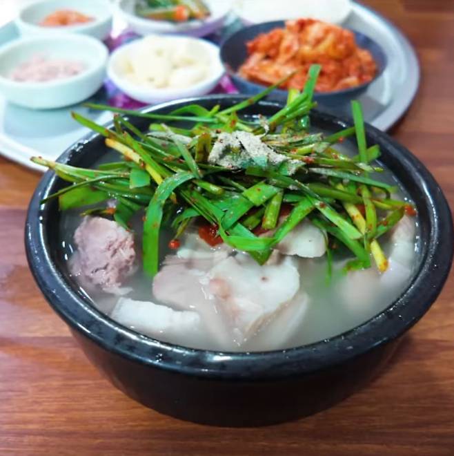 부추와 양념 다대기가 듬뿍 올라간 국물은 일반적인 뽀얀 국물 대신, 맑고 투명한 국물이며, 육수는 잡내 없이 깔끔하게 끓여내고, 첫 술부터 진하고 깊은 맛이 퍼진다.