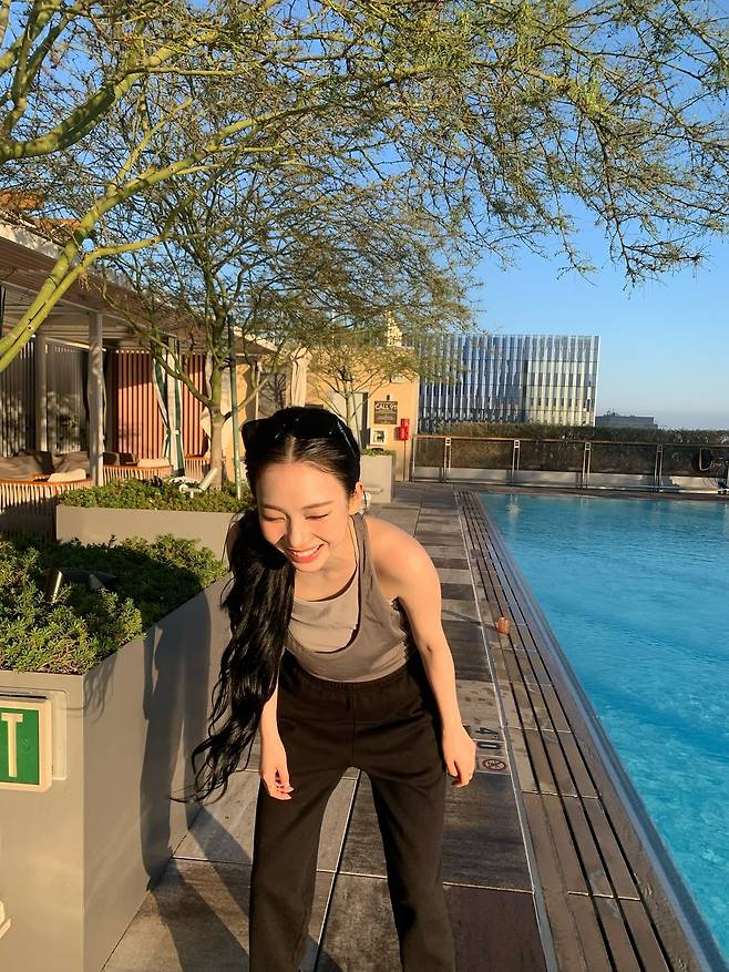 맑은 햇살이 가득한 수영장 옆, 카리나가 보여준 스타일은 운동과 일상의 경계를 자연스럽게 허문 애슬레저 감성이었다. 여유로운 미소와 함께 선글라스를 머리에 올린 모습은 한층 더 청량한 무드를 더했다.