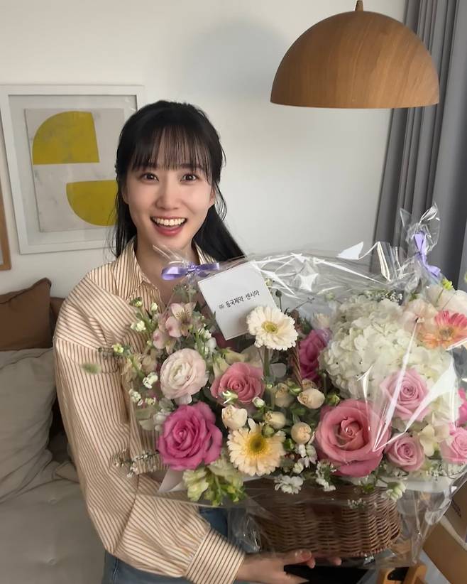 베이지와 화이트 스트라이프 패턴의 셔츠로 편안한 홈웨어 스타일을 연출하고 있다. 자연스러운 헤어스타일과 함께 꽃다발을 들고 있는 모습에서 일상적이면서도 따뜻한 매력을 보여주고 있다.
