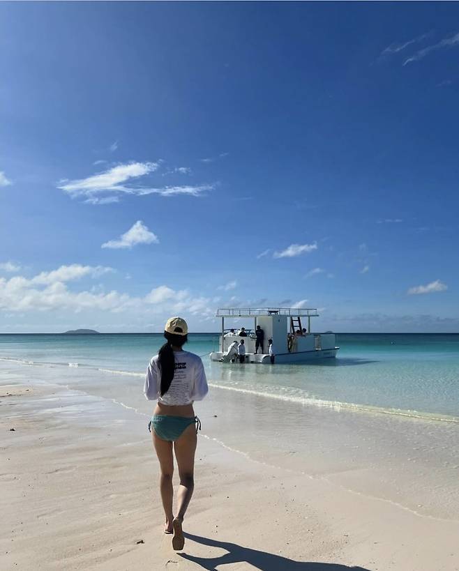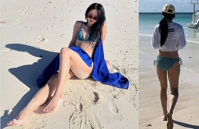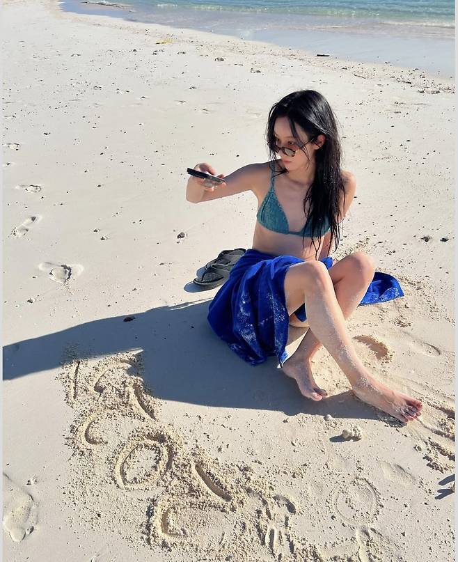 혜리는 청록색 비키니와 선글라스로 청량한 무드를 강조했습니다.