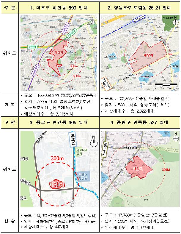종로구 연건동 305번지 일대(1만 4153㎡·477가구)와 중랑구 면목동 527번지 일대(4만 7780㎡·1022가구), 구로구 구로동 252번지 일대(1만 1428㎡·287가구)에서도 공공재개발이 진행된다.