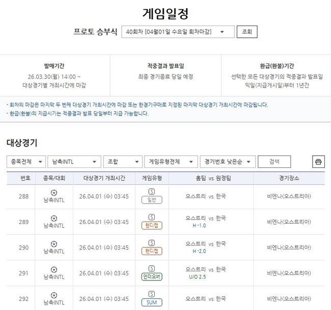 서울올림픽기념국민체육진흥공단(이사장 하형주)이 발행하는 체육진흥투표권 스포츠토토의 수탁사업자인 한국스포츠레저㈜가 오는 4월 1일(수) 03시 45분에 비엔나(오스트리아)에서 열리는 대한민국(원정)-오스트리아(홈)전을 대상으로 한 프로토 승부식 40회차 게임이 발매 중이라고 밝혔다.