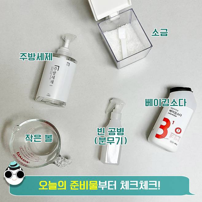 주방세제, 물, 소금, 베이킹소다, 분무기(펌프 용기), 작은 볼
