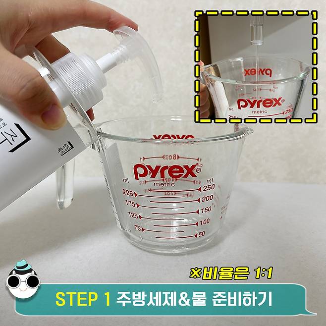 비율은 대략 1:1 정도로 맞춰주시면 되는데, 중요한 건 순서예요. 주방세제 먼저, 그 다음 물 순서로 투척해줄게요.
