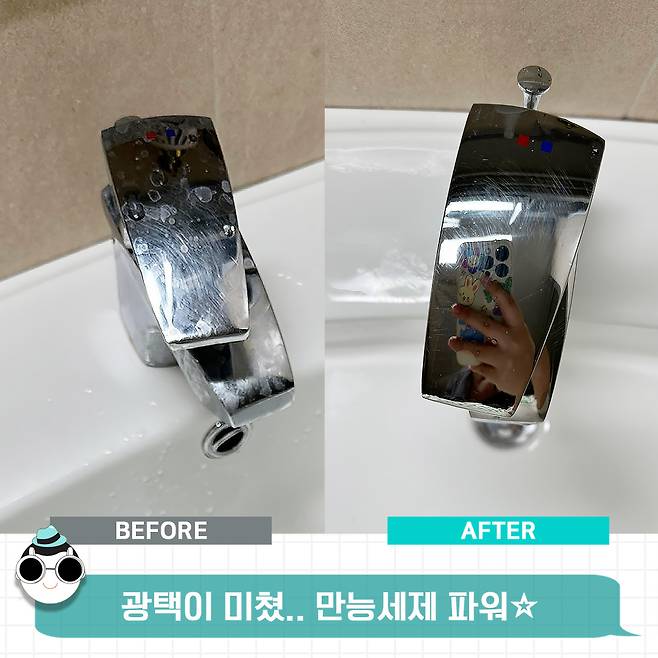 밥심 욕실 세면대나 수전에도 마찬가지로 이 만능세제를 이용해 청소를 해요. 특히 수전 같은 스테인레스 부분을 청소하면 이전보다 훨씬 광택이 나는 걸 확인할 수 있어요!