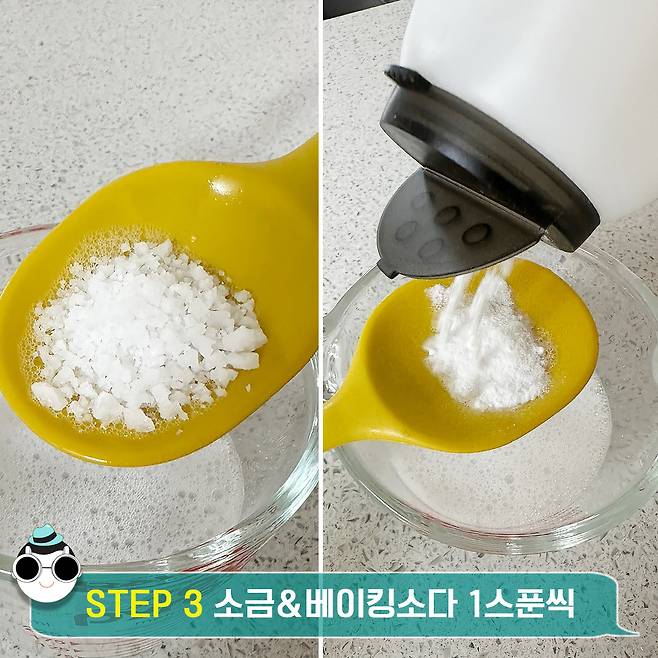 드~디어 완성된 만능세제. 원래도 베이킹소다는 각종 청소에 자주 쓰이곤 하죠? 근데 이게 또 소금과 만났을 때 효과가 훨씬 UP 된다는 사실.