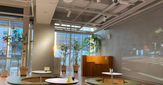 2층에는 강원도 양양 인구해변의 실시간 풍경을 대형 LED 화면으로 감상할 수 있는 글라스하우스 카페가 자리하고 있습니다.
