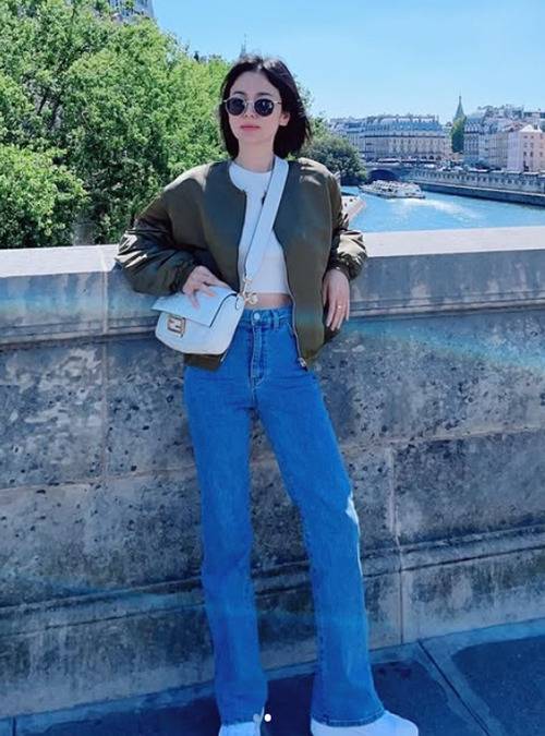 송혜교는 크롭 기장의 흰 티와 청바지를 매치해 스타일리쉬한 정석 조합을 완성했는데요.