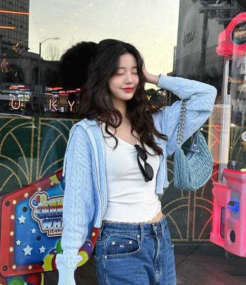 여기에 하늘색 집업을 매치해 상큼함을 더한 모습이에요!