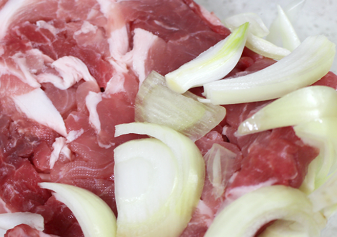 양파는 돼지고기 요리에서는 고기를 부드럽게 만들어주고, 잡내까지 잡아주는데요. 갈거나 채 썰어 고기와 함께 재워두면, 양파 속에 있는 효소가 고기의 섬유질을 부드럽게 해 줘요.