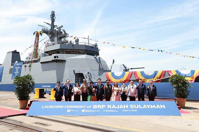 HD현대중공업은 11일 울산 본사에서 필리핀 2,400톤급 원해경비함 1번함인 '라자 술라이만함'의 진수식을 열었다고 밝혔다. 지난 3월 필리핀 초계함 2번함을 진수한 데 이어 올해만 두 번째 필리핀 수출 함정 진수다.