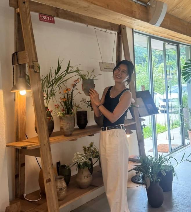 그릇을 고르는 모습, 화병을 들고 활짝 웃는 포즈는 꾸밈없는 자연미 그 자체.