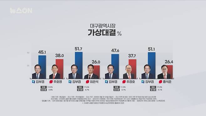 이 결과에 민주당 대구시당은 시장 선거 뿐만 아니라 기초, 광역 의원 선거 등에도 좋은 영향이 있을 수 있다는 분위기이고요. 공천 내홍을 겪고 있는 국민의힘은 대구도 뺏기나 하는 우려를 하고 있는데요. 다만, 이런 결과가 '보수 결집'을 유인할 것이라는 기대를 하고 있습니다. 다만, 일부에서는 다자대결 시 김 전 총리의 지지도보다 다른 국민의힘 예비후보들의 지지도 총합이 더 높다면서, 비관적으로 볼 필요는 없다는 분석도 있는데요.