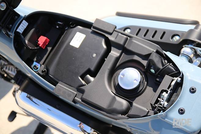 독특한 형태인 만큼 마치 연료탱크와 프레임이 일체화된 것이 아닌가 생각할 수도 있지만, 사실 연료탱크는 시트 하단에 숨어있다. 3.8L의 용량으로 시내에서야 문제될 것은 없지만, 장거리 주행에서는 조금 적다고 느낄 수도 있을 듯하다. 하지만 60km/h 정속 주행 연비가 55km/L에 달하니, 실제 주행에선 이보다 적은 40km/L로만 잡아도 1회 주행으로 152km를 달릴 수 있다. 이 정도가 적당한지 부족한지는 실제 시승에서 확인해보면 된다.