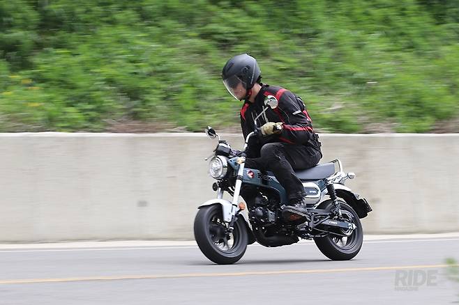 이제부터는 꾸준하게 달리는 시간이다. 경기도 양평을 출발해 달리기 시작했다. 다행히 날씨가 좋아 비옷을 챙기지 않아도 되는 점은 좋았지만 오히려 좀 덥다고 느껴질 정도의 날씨. 그래도 ST125가 꽤나 꾸준하게 달려주는 덕분에 주행풍이 금세 땀을 식힌다. 탑재된 124cc 공랭 단기통 엔진은 최고출력 9.4마력/7,000rpm, 최대토크 1.1kg·m/5,000rpm의 성능을 내는데, 이미 몽키나 MSX 그롬 등 여러 차례 경험해본 엔진이라 맘이 편하다. 키 196cm, 93~94kg 정도의 기자가 10kg 남짓의 가방을 메고 달려보니 계기판 상 최고속도는 105~106km/h 정도. 함께 시승을 진행한 기자는 170cm에 체중 72kg, 역시 촬영장비와 짐 등을 맨 상태에서의 최고속도는 117km/h로, 체중이나 덩치 등 여러 영향에 따른 속도 차이가 난다.