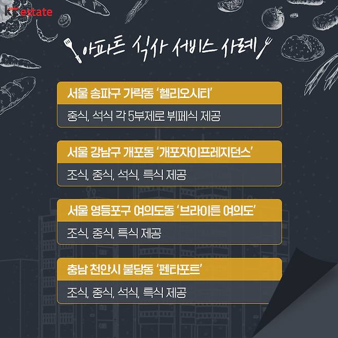 이에 헬리오시티나 펜타포트처럼 분양 당시 조식을 위한 시설을 따로 갖추지 않았으나, 입주민들의 요구를 반영해 조식 및 식음 서비스를 진행하는 단지까지 생겨나고 있습니다. 최근에는 조식에 더해 중식, 석식까지 제공하는 단지들도 출현하고 있으며, 서울 강동구 고덕동의 ‘고덕 그라시움’처럼 조식 배달 서비스를 진행하는 곳도 있습니다.
