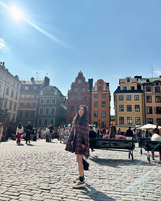 트위드 소재의 핑크 체크 코트를 입은 박주미는 유럽 거리 풍경과 어우러지며 세련된 도시적 스타일을 보여준다. 블랙 미니백과 캐주얼한 스니커즈를 매치해 편안하면서도 세련된 느낌을 살렸다. 밝은 날씨와 조화를 이루는 경쾌한 패션이다.