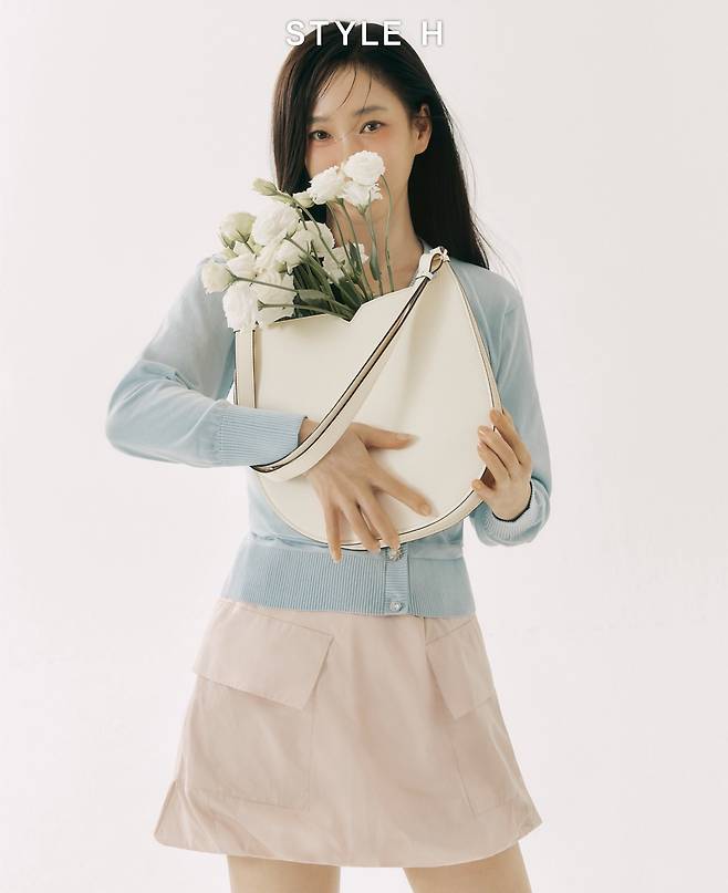 박주미는 하늘색 가디건과 베이비 핑크 스커트를 매치해 봄의 산뜻함을 연출했다. 여기에 화이트 컬러의 반달 모양 숄더백을 더해 심플하면서도 세련된 분위기를 완성했다. 가방 속 꽃다발은 자연스러운 소품 활용으로 따뜻한 감성을 더하고 있다.