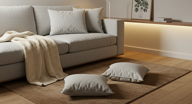 따라서 공간에 너무 차가운 느낌이 든다면, 가벼운 패브릭 교체만으로도 분위기를 크게 바꿀 수 있습니다.