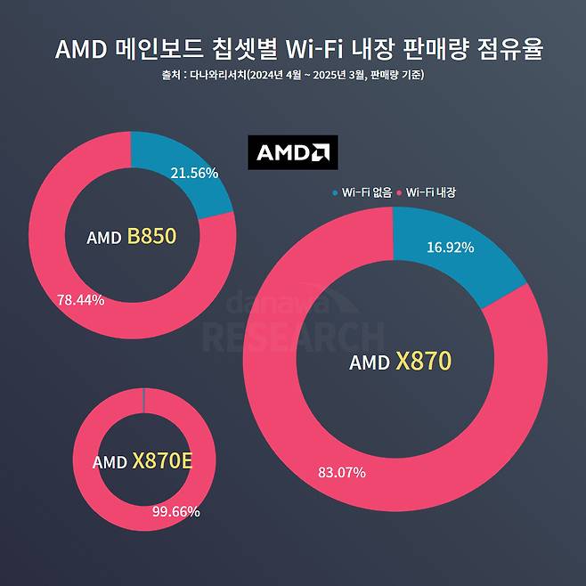 이러한 Wi-Fi 내장 비율의 증가는 메인보드 칩셋이 최신일수록, 그리고 등급이 높을수록 더욱 뚜렷하게 나타난다. 쉽게 말해, 최신 고급형 메인보드는 대부분 Wi-Fi 기능을 기본 탑재하고 있다고 해도 과언이 아니다. 실제로 AMD의 상위 칩셋인 X870 기반 메인보드는 약 83.07%가 Wi-Fi를 내장하고 있으며, 최상위 모델인 X870E 제품군은 무려 99.66%에 달하는 압도적인 점유율을 기록했다. 보급형 라인업인 B850 칩셋을 탑재한 제품도 78.44% 점유율로 Wi-Fi 내장형 메인보드가 상당히 보편화되기 시작되었음을 알 수 있다. 같은 기간 이전 세대인 600번대 칩셋의 Wi-Fi 내장 제품 점유율은 B650이 30.4%, X670이 69.58% 수준이다.