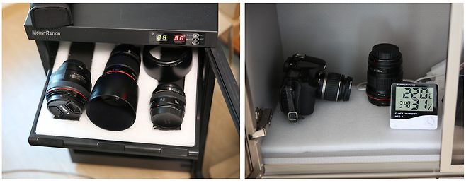 제습함이 있으면 제습함에 보관하시고, 없으면 장식장 같은데 스펀지 깔고 두셔도 됩니다.