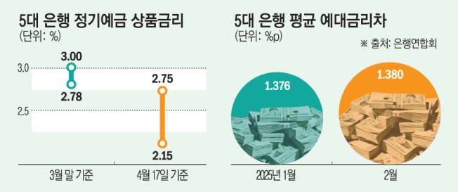 시장금리는 계속 내려가고 있다. 지난해 10월 한은의 '피벗'(통화정책 전환) 분위기를 선반영한 것이다. 예금금리도 하락세다. 은행연합회에 따르면 이날 기준 5대 은행(KB국민·신한·하나·우리·NH농협)의 12개월 만기 정기예금 기본 금리는연 2.15~2.75%로 전월(2.78~3.0%) 보다 0.3~0.6%포인트(p) 가량 떨어졌다. 경기 침체로 한은의 기준금리 인하 예상 횟수가 애초 상반기 2회에서 하반기까지 총 3회로 늘어날 수 있다는 시나리오까지 제기되면서 예금금리가 가파르게 떨어질 공산도 크다.