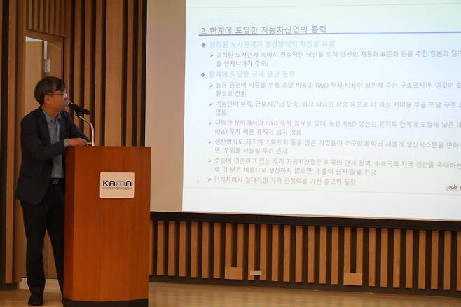 조철 산업연구원 선임연구위원은 ‘한국자동차산업의 당면과제와 발전 방향‘이란 주제발표에서 “국내 생산여건의 악화로 주요 기업들은 추가적인 공장건설을 하지 않았고, 공장 폐쇄와 근로시간 단축 등으로 생산 능력이 위축되어, 국내 생산량이 감소하며, 자동차생산순위도 2022년 5위에서 2024년 7위로 하락했다”며 “한국 자동차산업은 저임금 노동에 의존한 낮은 단가와 고품질의 부품조달 그리고 R&D 부문의 높은 생산성과 생산방식의 혁신 덕분에 지금까지 유지되어 왔으나 최근의 산업 환경 변화로 이러한 생산경쟁력이 한계에 직면했다”고 설명했다.