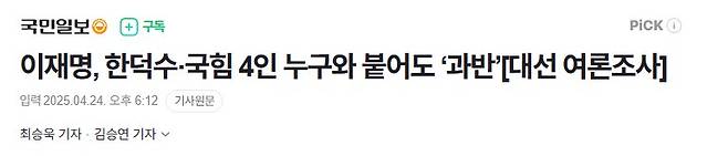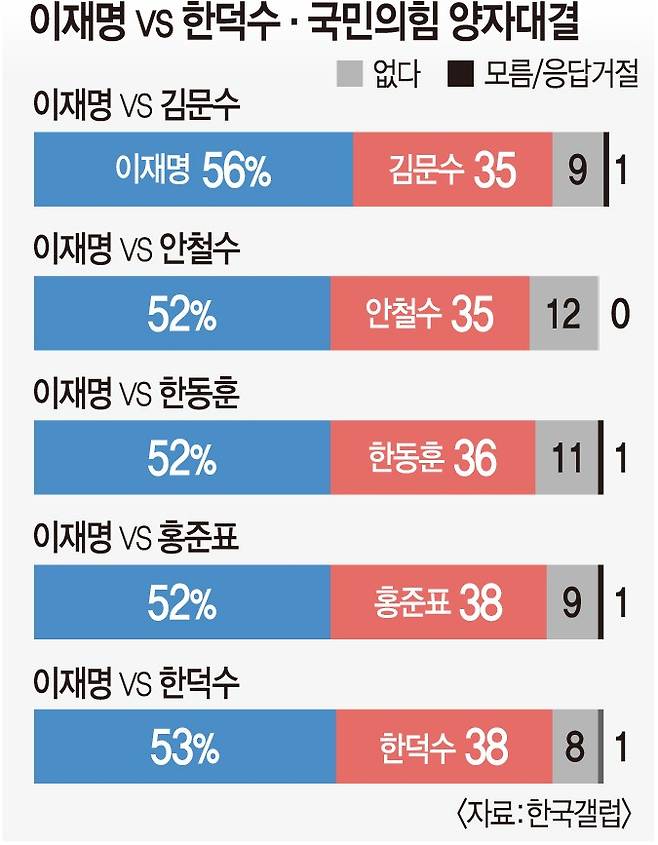 국민일보·한국갤럽이 지난 23~24일 전국 만 18세 이상 남녀 1004명을 상대로 조사한 결과 이 후보는 가상 양자·3자대결에서 보수진영에서 거론되는 후보 누구와 붙어도 압도적 우위를 보였다. 조사는 국민의힘이 지난 22일 경선 후보를 4명으로 압축한 이후 진행됐다.