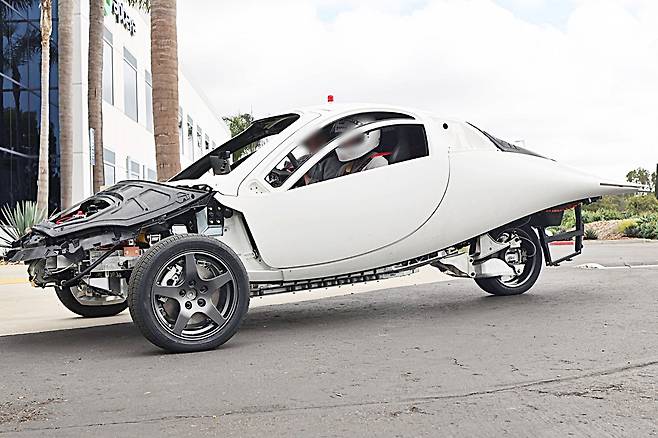 앱테라 차량의 가장 큰 특징은 전통적인 4륜이 아닌 3륜 구조와 초경량 복합 소재 차체다. 이러한 설계는 에너지 소모를 획기적으로 줄이기 위한 선택이며, 0.13 Cd 수준의 낮은 공기저항계수는 항공기 수준의 공력 성능을 자랑한다. 차량 무게는 약 800kg 내외로, 동급 전기차보다 절반 이상 가벼운 것이 특징이다.