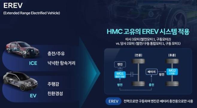 EREV(주행거리 연장형 전기차)는 기존 하이브리드와 구조적으로 차별화된다. 일반 하이브리드 차량이 엔진과 모터를 함께 사용해 바퀴를 구동하는 방식이라면, EREV는 오직 전기모터만으로 차량을 움직인다.