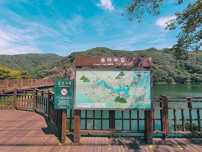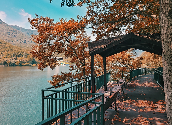 총길이 3.9km의 산책로는 나무데크 2.2km, 흙길 1.7km로 구성되어 있으며, 왕복 약 2시간 정도면 여유롭게 걸을 수 있습니다. 길을 따라 걷다 보면 왼편으로는 울창한 숲이, 오른편으로는 담양호의 잔잔한 물결이 나란히 이어집니다. 특히 목교 구간은 곡선의 선형미가 돋보여, 자연과 인공의 조화가 인상적입니다. 가을이면 붉은 단풍과 노란 낙엽이 길 위에 수놓아져, 호수 위로 반사되는 풍경이 더욱 따뜻하게 느껴집니다.