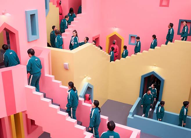 <오징어 게임>을 통해 제74회 크리에이티브 아츠 에미상® 내러티브 컨템포러리 프로그램 부문 프로덕션 디자인상(1시간 이상)을 수상했던 채경선 미술감독은 “시즌1에 보내주신 큰 사랑과 시즌2에 대한 많은 분들의 기대감에 큰 책임감을 느낀다. 황동혁 감독님의 크레이티브 비전과 주제 의식을 잘 구현해 낼 수 있도록 미술팀 모두가 힘쓰고 있다"고 시즌2 작업 과정을 전했다. 이어 그는 핑크 미로 복도에 대해 “시즌1보다 높이와 넓이 모두 더 규모감 있는 설계를 했고, 유아적인, 동심의 색깔이 무엇인가 고민하며 대표적인 컬러감으로 핑크를 선택했다”며 “이 공간은 네덜란드의 판화가 에셔의 작품에서 영감을 얻어 디자인하게 되었고, 그의 작품의 어떤 모순과 역설 같은 부분들을 <오징어 게임>의 주제에 맞게 표현하고 싶었다”고 덧붙였다.