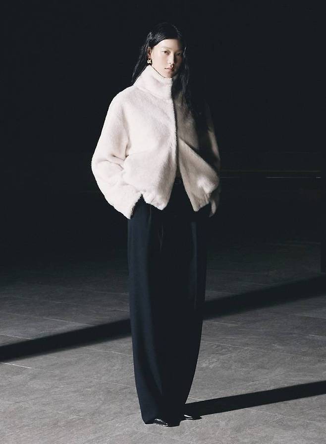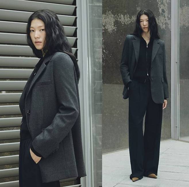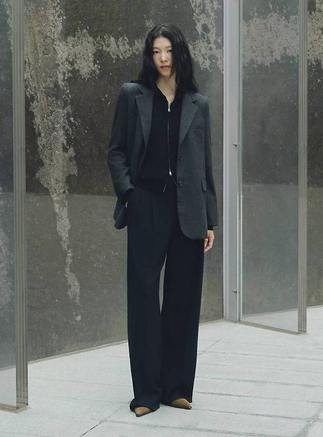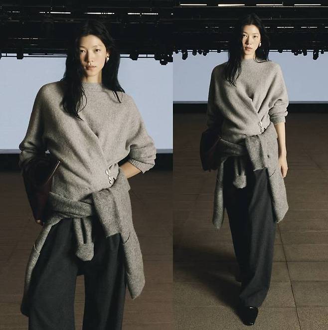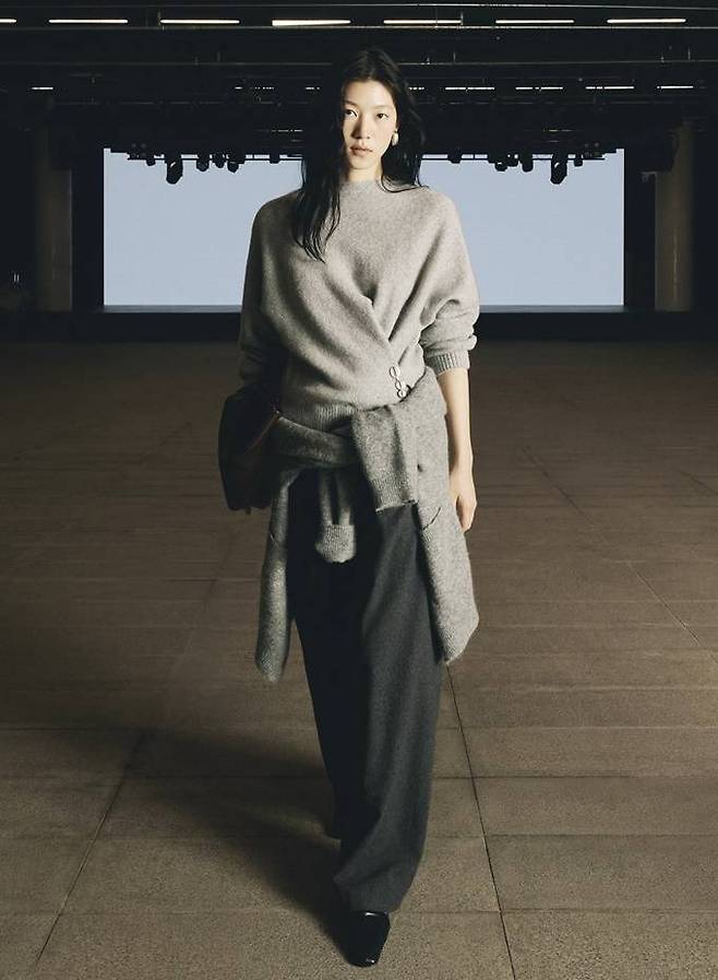 모델 정청솔은 스웨터와 정장 바지, 여기에 카디건을 허리라인에 걸친 스타일링으로 포근하면서 시크한 파워우먼 오피스룩으로 더욱 멋스럽게 연출했다.
