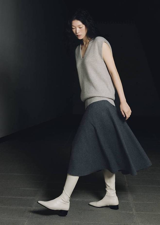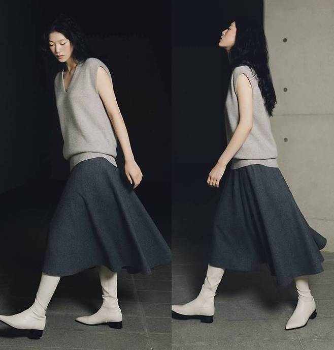 '쉬즈미스' V넥 니트 베스느는 짧지 않는 기장감과 루즈한 실루엣으로 포근한 가을 감성을 전한다. 모델 정청솔은 플레어 스커트를 매치하면 섹시함이 깃든 페미닌룩을 연출했다.