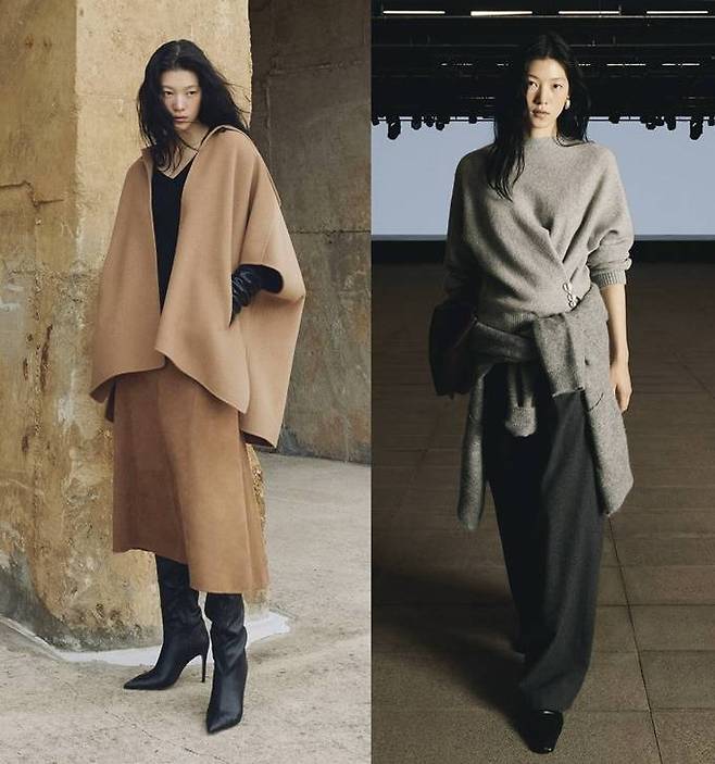특히, 이번 가을에는 특유의 따뜻한 감성과 실용성을 동시에 담은 톤온톤 니트웨어 스타일링을 비롯해 카멜 컬러의 구조적 실루엣이 돋보이는 케이프와 스웨이드 롱스커트, 멜란지 그레이 니트와 다크 그레이 팬츠, 풍성한 가디건 스타일링은 레이어링의 진수를 보여준다.